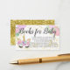 Linda face de unicórnio com cílios e chifre, e efeito de glitter dourado impresso plano (sem glitter real), cartão de inserção de Pedido de Livro para Convite de Chá de Bebê com tema feminino lindo, redemoinhos e estrelas, e texto cinza escuro. Esse pequeno poema adicionado ao seu cartão de inserção de convite de chá de bebê sugere que os convidados assinem e tragem livros em vez de cartões para os presentes do chá de bebê para a menina que está a caminho.