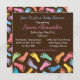 As pegadas coloridas de bebês decoram este convite. Fácil de personalizar. Excelente para qualquer sexo. Ilustração original por pj_design.