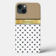 Esta design única de combinação entre as cores marrom-estrela e dourado com bolinhas pretas em fundo branco é certamente uma declaração. O gabinete apresenta um padrão de bolinhas branco e preto em negrito com um nome personalizado de fita estelar marrom e dourada. A design oferece um bom contraste da fita marrom-estrela e dourada contra o preto e o branco. Este padrão ocular é perfeito para uma variedade de itens, como capas de telefone e bolsas.