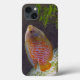 A fotografia original neste caso mostra uma natação dos peixes do gurami do anão em um aquário. Este peixe tropical colorido tem um corpo alaranjado com listras verticais que olham a luz iridescente - azul na luz solar. As folhas do verde de uma planta subaquática podem ser vistas em um canto da foto, parte de um grande seashell em um outro canto atrás dos peixes, e o fundo é uma cinza média textured.