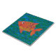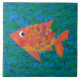 Um Azulejo cerâmico colorido de grande porte, com um Peixe Laranja e Amarelo de cor castanho e fundo azul profundo e verde, de uma colagem de papel pintada à mão, por Judy Adamson. Parte da coleção Posh e Painterly 'Fish in the Sea', este padrão pode ser ajustado para ajustado qualquer Azulejo, assim você pode também mudar a escala se quiser. Você pode personalizar este Azulejo ainda mais removendo a camada de fundo azul/verde e escolhendo uma cor simples. Como alternativa, você pode remover o Motif de Peixe. (Adicionar uma armação de madeira para usar como Trivet.)