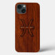 Um símbolo Zodiac Peixes renderizado em um rico fundo de design de grão de madeira de Mahogany. Um design clássico para uma ideia de presente de aniversário personalizada de excelente.