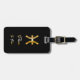 Etiqueta de bagagem elegante com peixes dourados em fundo preto.