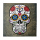 Impressão do crânio perfeito para o Dia De Los Muertos, comemorações piratas ou apenas para uso diário. Crânio branco com rosas vermelhas e sotaques azuis, roxos e amarelos sobre fundo brando.