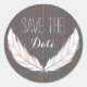 Umas economias a etiqueta da data que caracteriza uma ilustração de um par de penas. O fundo é barnwood inspirado.