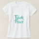 Camisa branca feminina com texto teal "Think Peace" na frente. O poder da positividade em uma camiseta.