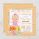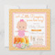 Um convite para chá de fraldas de abóbora com uma adorável menina vestindo uma roupa rosa e fofinha sentada em uma abóbora em um fundo cor-de-rosa e laranja. Você pode personalizar facilmente esses adoráveis convites para o seu evento para o chá de bebê, cor-de-rosa e laranja, simplesmente adicionando seus detalhes.