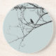 Um solitário pequeno pássaro preto se senta num galho de uma árvore.