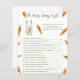 Convites para chuveiros de bebês neutros em termos de gênero. Apresentando o ditado "UM PEQUENO BUNNY ESTÁ A CAMINHO!", uma ilustração de um coelho aquoso (coelho) com cenoura em patas, e muitas cenouras cor de laranja. Itens correspondentes disponíveis.