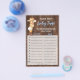 O Pequeno Cowboy dá o nome do cartão de jogo do Chá de fraldas do bebê Tune. Mude a redação para o design. Para alterações adicionais (cor da fonte, estilo da fonte, remover ou mover elementos), clique em personalizar, role para baixo e clique no link "Editar usando a ferramenta Design". ** O fundo da madeira é incorporado ao design para ser impresso em papel branco. ** - Verifique na coleção todos os designs correspondentes - HOW TO PLAY: Toque dez músicas de amor com a palavra Baby nela e os convidados adivinharão o título e o artista de cada música.