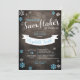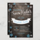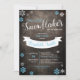 Design apresenta o texto "Dois pequenos flocos de neve estão a caminho" junto com flocos de neve azuis e brancos sobre um fundo de madeira rústico. A design é perfeita para um chá de fraldas gêmeo temido de inverno. O texto pode ser personalizável para ajustado das informações que você precisa colocar no cartão de convite.