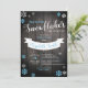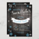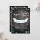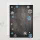 Design apresenta o texto "Dois pequenos flocos de neve a caminho" junto com flocos de neve azuis e brancos sobre fundo de madeira rústico. O design é perfeito para um chá de fraldas gêmeo de inverno. O texto pode ser personalizável para ajustado das informações que você precisa colocar no cartão de convite.