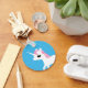 Um chaveiro com uma ilustração vetorial adorável de um Unicórnio branco com um manequim cor-de-rosa fluente sobre fundo azul.