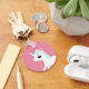Um chaveiro com uma ilustração vetorial adorável de um Unicórnio branco com um manequim azul fluente sobre fundo rosa.