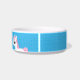 Uma tigela de animais de estimação com uma ilustração vetorial adorável de um Unicórnio branco com um homem cor-de-rosa fluente sobre um fundo azul.