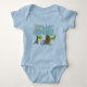 Pequenas T-shirts de primeiro aniversario Bluebird, fatos-chave, cartas, sacos-tote, botões e mais apresentam duas árvores altas com um pequeno pássaro azul num galho, flores e texto que diz "Hoje eu sou UM"!