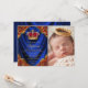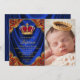 O convite do príncipe batismo com a coroa vermelha azul e dourada em um lindo fundo azul real e vermelho de satírico dourado. Este elegante convite para batismo de príncipe azul e coroa dourada é facilmente personalizado para o seu evento, adicionando detalhes de fotografia e evento, estilo de fonte, tamanho e cor de fonte e texto.