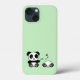 Um par de bonitos pandas de desenho. O panda esquerdo está segurando um bastão de bambu observando o panda direito que adormeceu.