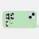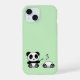 Um par de bonitos pandas de desenho. O panda esquerdo está segurando um bastão de bambu observando o panda direito que adormeceu.