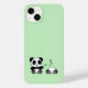 Um par de bonitos pandas de desenho. O panda esquerdo está segurando um bastão de bambu observando o panda direito que adormeceu.