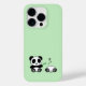 Um par de bonitos pandas de desenho. O panda esquerdo está segurando um bastão de bambu observando o panda direito que adormeceu.