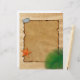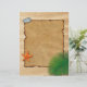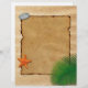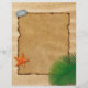 Papel-pergaminho antigo com folha de palma, pedra e estrelas-do-mar sobre fundo de areia de praia.