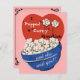Ilustração vintage boba, engraçada, imagem humorística com uma grande tigela de pipoca com dois grãos fofos voando pelo ar. Uma maneira divertida de anunciar seu noivado, especialmente para os amantes de cinema!