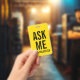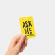 Pergunte-me| Título do Voluntário Amarelo Badgefeitando em branco negrito sans serif em fundo amarelo.