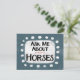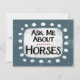 "Pergunte-me sobre Cavalos" é um design de texto divertido com uma forma de sotaque branca cercado por pontos brancos texturizados.