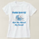 A orgulhosa nova mãe e pai dos gêmeos bebês amará esta design bonitinha com dois coelhos de menino e texto azul que diz "Twin Boys! Pergunte-Me Sobre Os Meus Filhos!" T-shirts, cartões, botões, magnetos, bolsas, mousepads e muito mais!