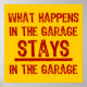 Essa design engraçada vai deixar o mundo saber que sua garagem é sagrada. O que acontece na garagem, fica na garagem! Legal texto angustiado. Excelente ou presente de aniversário. Duas cores disponíveis. PinkInkArt original!