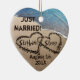 FYI: O ornamento da forma cardíaca com este design está agora disponível em acrílico. Adicione facilmente seus próprios nomes personalizados ou qualquer texto (mostrado como, por exemplo, "Recem casados" com os nomes da noiva e do noivo nos corações e a data) para personalizar este lindo ornamento popular de forma cardíaca com uma foto original de dois corações escritos na areia ao longo da água azul do oceano para significar amor e romance. Conceito de excelente para amor, viagem, primeiro feriado de Natal juntos, e próximo verão salve os casamentos de data. Um enfeite especial, divertido, pessoal e único para dar a essa pessoa especial, namorada ou namorado, noiva e noiva ou a qualquer casal. Este design está de um lado e também está disponível com o design de ambos os lados.