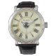 Personalize este design com banda de couro. Este é um relógio de na moda com números romanos e estilo clássico. Adicione suas iniciais ou outro texto para personalizar para você ou como presente para alguém especial.