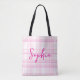 Cute personalized tote bag with soft pink plaid pattern and custom name in elegant script. Perfect for everyday use, shopping, school, travel, and casual outings. This reusable canvas tote makes a lovely gift for girls, teens, bridesmaids, birthdays, and anyone who loves aesthetic accessories with a personal touch.
