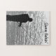 Deixe-nos obter longe dele todo e ir pescar! Facilmente personalize ou remova o texto neste quebra-cabeça de serra de vaivém que caracteriza uma imagem preto e branco de um pescador solitário que está em uma borda da rocha no lago Seneca em Genebra, New York. O texto lê: Fishin ido