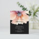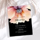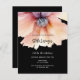 Um convite moderno, na moda e glamouroso para uma festa de aniversário 50ª (ou qualquer idade). Fundo de cor preta, decorado com um pêssego grande e uma flor de cor aquosa púrpura. O nome é escrito com um script de estilo com letra de modo manual. Personalize e adicione os detalhes da sua festa. 1 folha = 1 convite impresso de borda a borda.