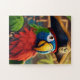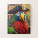 Um quebra-cabeça de papagaio vibrante mostrando um papagaio colorido empoleirado numa selva, cercado por flores exóticas e verde