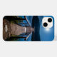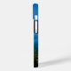 Uma capa de telefone com uma bela fotografia de um píer de madeira esticando-se sobre um lago calmo. O céu noturno coberto de estrelas e uma bela lua de cheio.