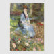Pierre-Auguste Renoir - Dans les Rosas. Um retrato bonito de uma jovem em cores quentes. Uma garota se senta em um banco em um louco sombrio. As flores crescem por perto. Há árvores altas atrás dela. Reprodução de famosas imagens de arte no dominio público.