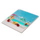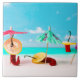Três pimentões vermelhos na praia. Dia ensolarado quente, mar azul, areia branca, guarda-chuvas e sombreros. Dois pimentos são sonolentos debaixo de guarda-chuvas de praia, o terceiro está caindo no fundo da água. Cada hora é uma hora feliz na praia. Sol, Mar, Areia, Sombrero. Produtos e presentes de formato quadrado