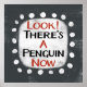 Um design de animais tipográficos irreverentemente estranho que diz "Olha! Há um pinguim agora". Ele apresenta texto preto e vermelho em um retângulo branco com pontos brancos engraçados e brincalhões ao redor dele, tudo em um fundo de cinza.
