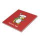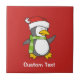 Um pequeno desenho animado de pinguim com chapéu de santa e cachecol verde andando na neve.
