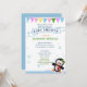 Convite para chá de fraldas de pinguim bonito. Um fundo colorido. O pinguim tem um arco de cabelo verde e está parado em um icebergue. Kristi W/Graphic's n Bits.