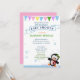 Convite para chá de fraldas de pinguim bonito. Um fundo colorido. O pinguim tem um arco de cabelo verde e está parado em um icebergue. Fundo rosa. Kristi W/Graphic's n Bits.