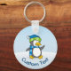 Um pequeno desenho animado de pinguim com chapéu e cachecol andando na neve. Texto personalizado de ambos os lados.