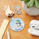 Um desenho animado de um pequeno pinguim acenando na frente de uma pilha de bolas de neve. Texto personalizado em ambos os lados.