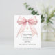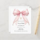 A white background, decorated with a pink large bow with pearls and a golden cross. Personalize and add a name and details details.