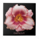 Azulejo cerâmico que mostra a foto de um adorável e rosa florescente de Daylily em um fundo preto. Um design floral dramático! Selecione o tamanho do seu azulejo. Faz uma trivet de cozinha excelente!