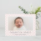 Anuncie seu pacote de alegria com estilo! Este doce e simples anúncio de nascimento personalizado apresenta um padrão de gingham rosa e o nome do seu bebê, estatísticas de natalidade e o seu nome. Este design também está disponível em azul e verde! Dica: Use o botão "recortar foto" na seção de personalização.