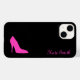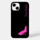 A forma de um calçado rosa brilhante de salto alto contra fundo preto.
